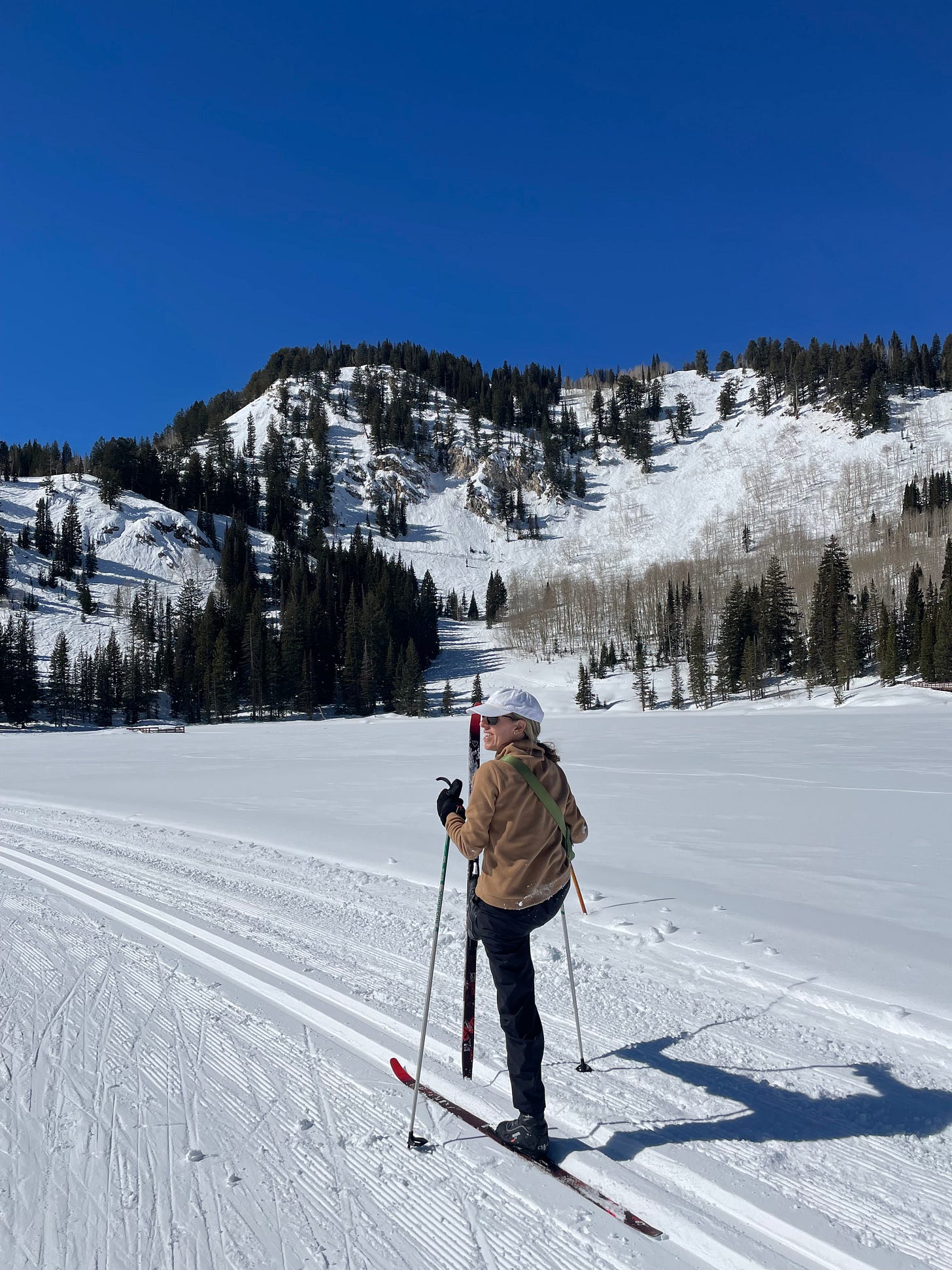I admit to being a terrible downhill skier. I did not grown up skiing or doing any winter sports, and the by the time I tried snowboarding in the icy Troodos Mountains of Cyprus (a terrible place to learn, BTW), I knew I disliked heights, unchecked speed and landing on my bottom. I’ve taken some downhill lessons since, and while I am fine on a bunny hill, it’s just not my thing. Still, I had wanted to try cross-country skiing for ages, so this year seemed like my opportunity. I contacted the Nordic Center at the Solitude Resort and signed up for a two-hour, private lesson. While my family raced down the slopes of Snowbird, I caught the bus up to Solitude and rented my equipment and purchased a trail pass. My teacher, Anya was amazing— friendly, patient and relaxed, and once she learned I practiced yoga, she put her instructions to me in yoga terms, and I was able to pick up the basics of Classic Nordic more quickly than I expected. (There is also the Skate Skiing form of cross-country, but I’ll tackle that adventure on another trip!) After the lesson, I took a lunch break at the nearby Brighton Resort, then got back on my narrow skis and practiced around the Nordic track until it was time to head back to the hotel. Before I left, I signed up for another private lesson with Anya for the next day to begin working on hills and turns.